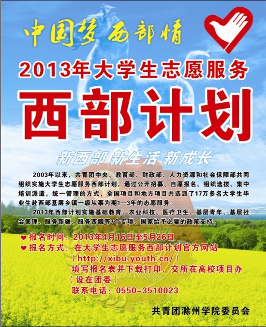 2013年大学生志愿服务西部计划正式启动,请有意向的同学登陆西部计划官方网站(http://xibu.youth.cn/),填写报名信息,下载打印《报名登记表》,由辅导员或学院团总支负责人签字、所在院(部)党组织盖章后,