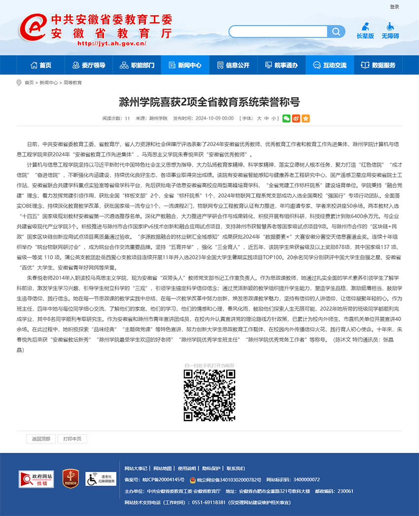 【安徽教育网首页】太阳成集团tyc9728喜获2项全省教育系统荣誉称号