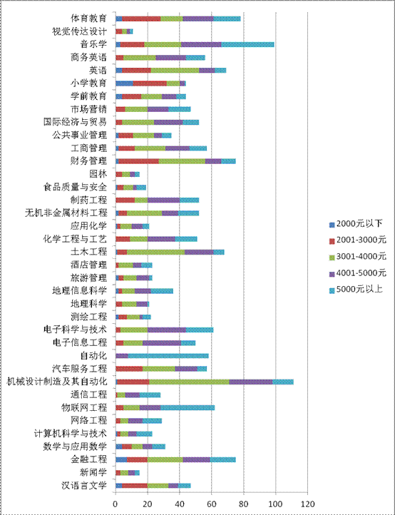 专业 | 2000元以下 | 2001-3000元 | 3001-4000元 | 4001-5000元 | 5000元以上 | |||||