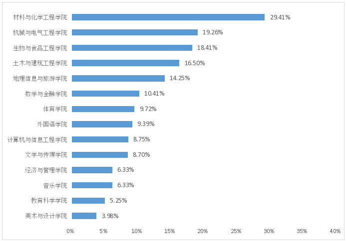 数学与金融学院、地理信息与旅游学院、土木与建筑工程学院、生物与食品工程学院、机械与电气工程学院和材料与化学工程学院等6个学院的升学率超过10%,其中材料与化学工程学院的升学更是接近30%,各学院毕业生升学率(含出国出境)占比分布如图1-9: