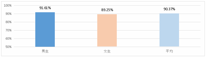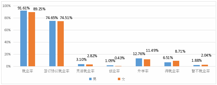 毕业生中,男生总体就业率91.61%,女生总体就业率89.25%;男女生的总体就业率相对均衡,男生略高。