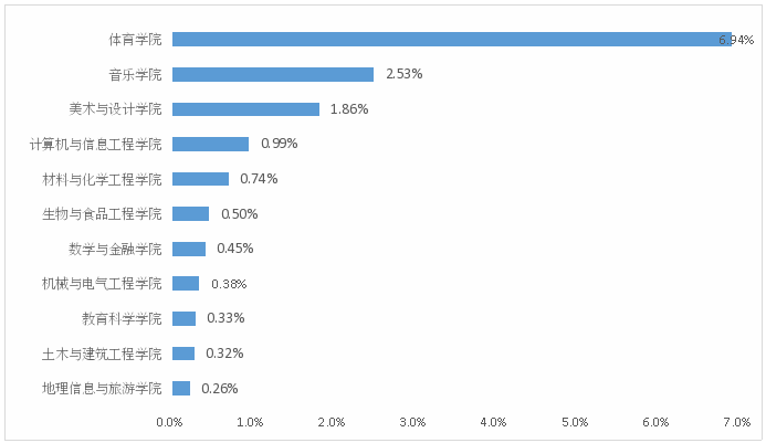 经济与管理学院、体育学院、音乐学院和教育科学学院等4个学院没有毕业生通过灵活就业方式就业。各学院毕业生灵活就业率占比分布如图1-7: