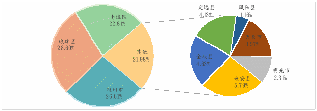 2020届毕业生在滁州市就业(含升学等)人数为605人,其中琅琊区173人(28.60%)、滁州市161人(26.61%)和南谯区138人(22.81%)。 2020届毕业生在滁州就业分布情况(市区和县市区)如图2-14。