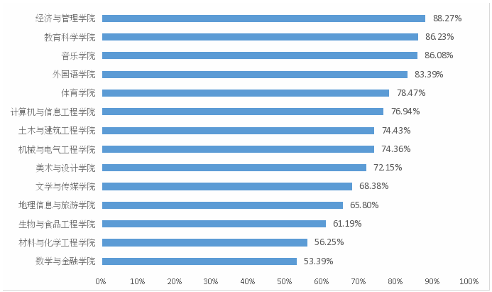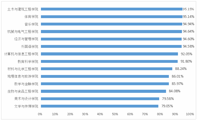 教育科学学院、计算机与信息工程学院、外国语学院、经济与管理学院、机械与电气工程学院、音乐学院、体育学院和土木与建筑工程学院等8个学院的就业率超过90%。