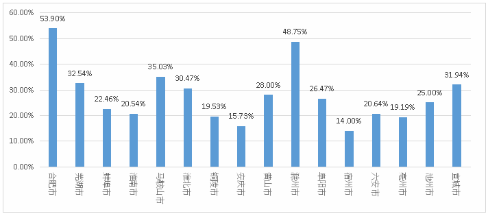 2020届毕业生省内学生回家乡工作比例分布如图2-15和图2-16,回家乡比例最高的三个城市分别是:合肥市(53.90%)、滁州市(48.75%)和马鞍山市(35.03%)。