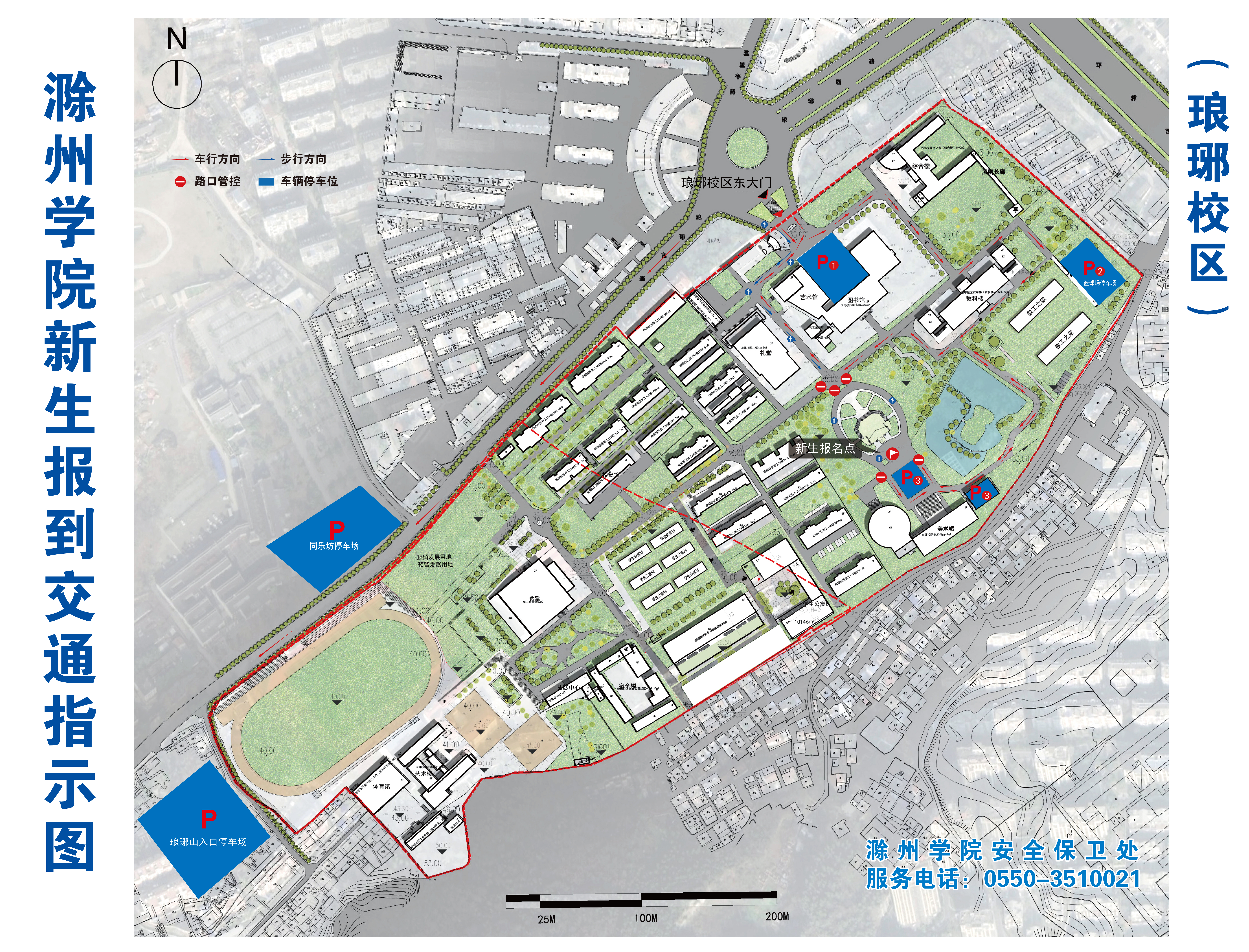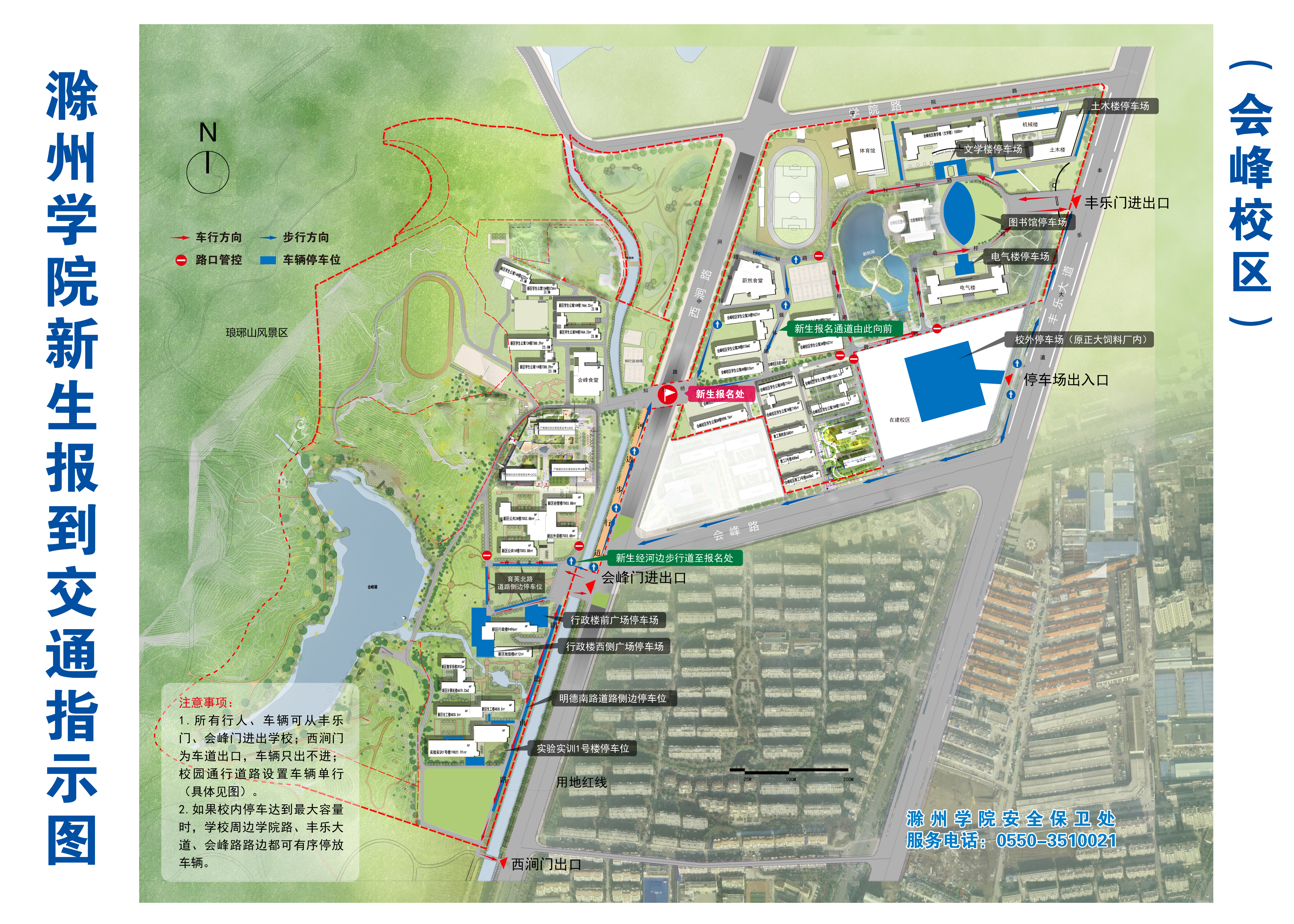 2.校外停车报到。沿琅琊古道自东向西将车辆停放于同乐坊停车场或琅琊山景区入口停车场,后步行至琅琊校区东大门,在图书馆广场前道路右转,经让泉路自北向南步行至指定地点报到。